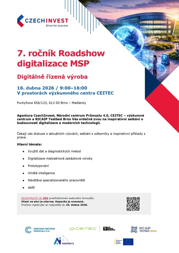 Připojte se k sedmému ročníku roadshow „Digitalizace malých a středních podniků“, která se tentokrát uskuteční v Brně v moderních prostorách CEITEC VUT. Hlavním tématem bude digitálně řízená výroba. Těšit se můžete na spoustu inspirace, praktické ukázky a konkrétní nástroje, které firmám pomáhají zvládat digitální transformaci v praxi.